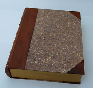 This is a half bound compensation binding. Bound in bright blue and crimson Morocco with hand marbled paper sides, presented in a clam shell box covered in bright blue and Fuchsia book cloth. This was a special edition made as a gift and is unique.